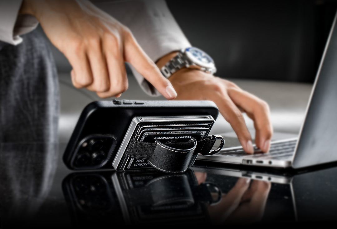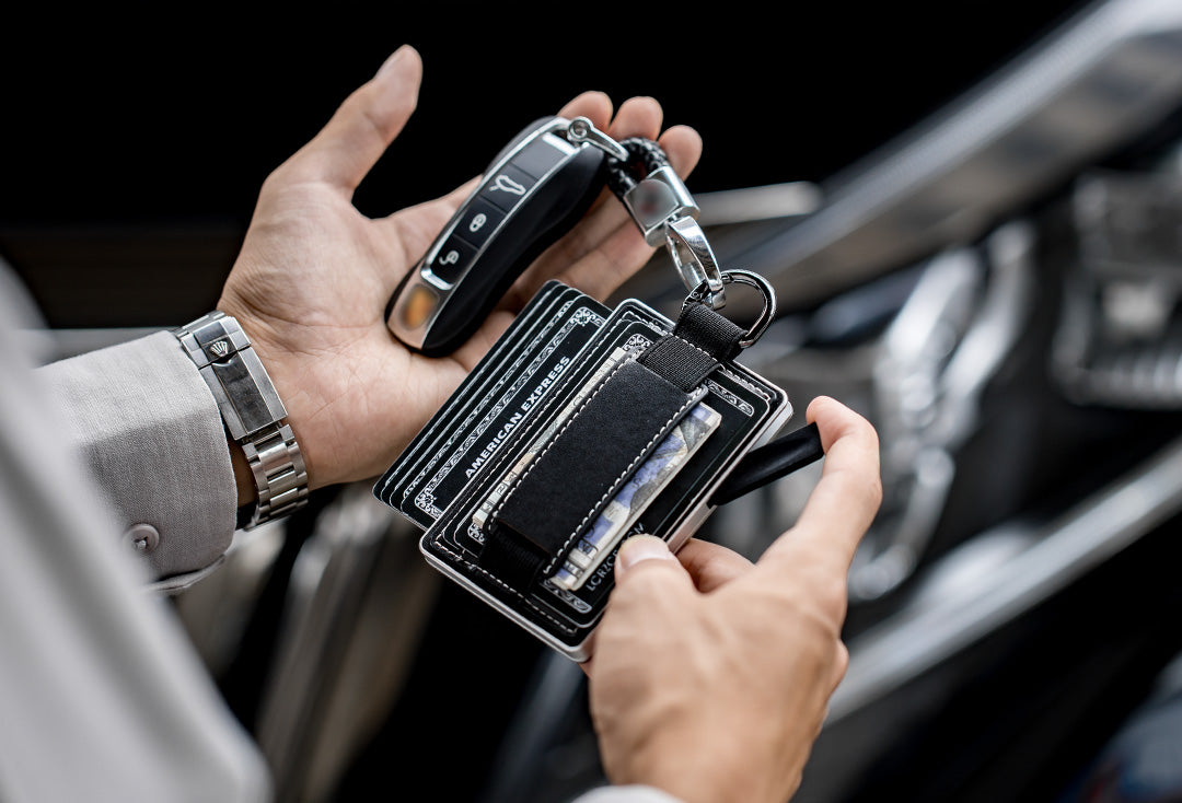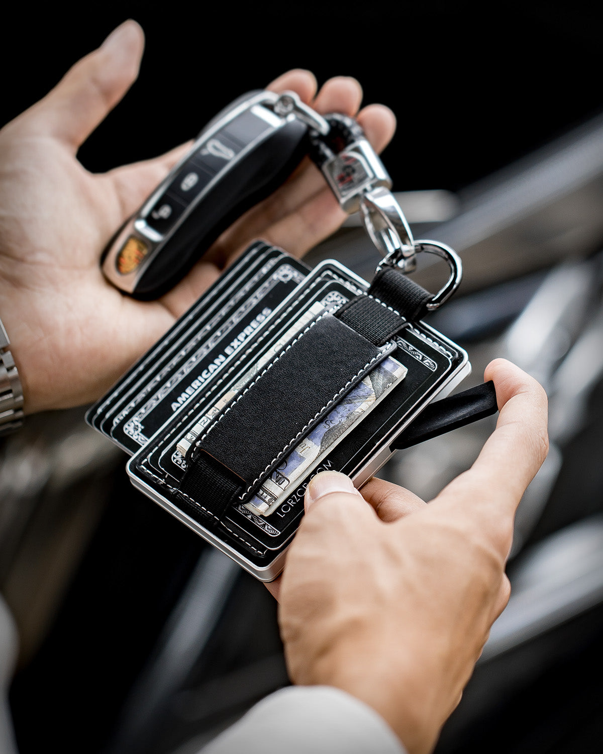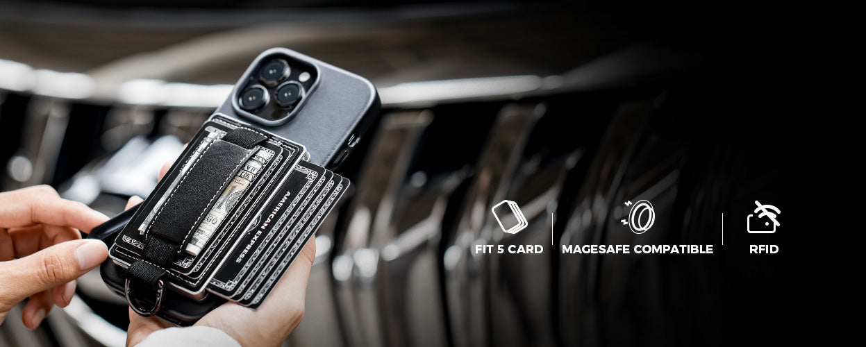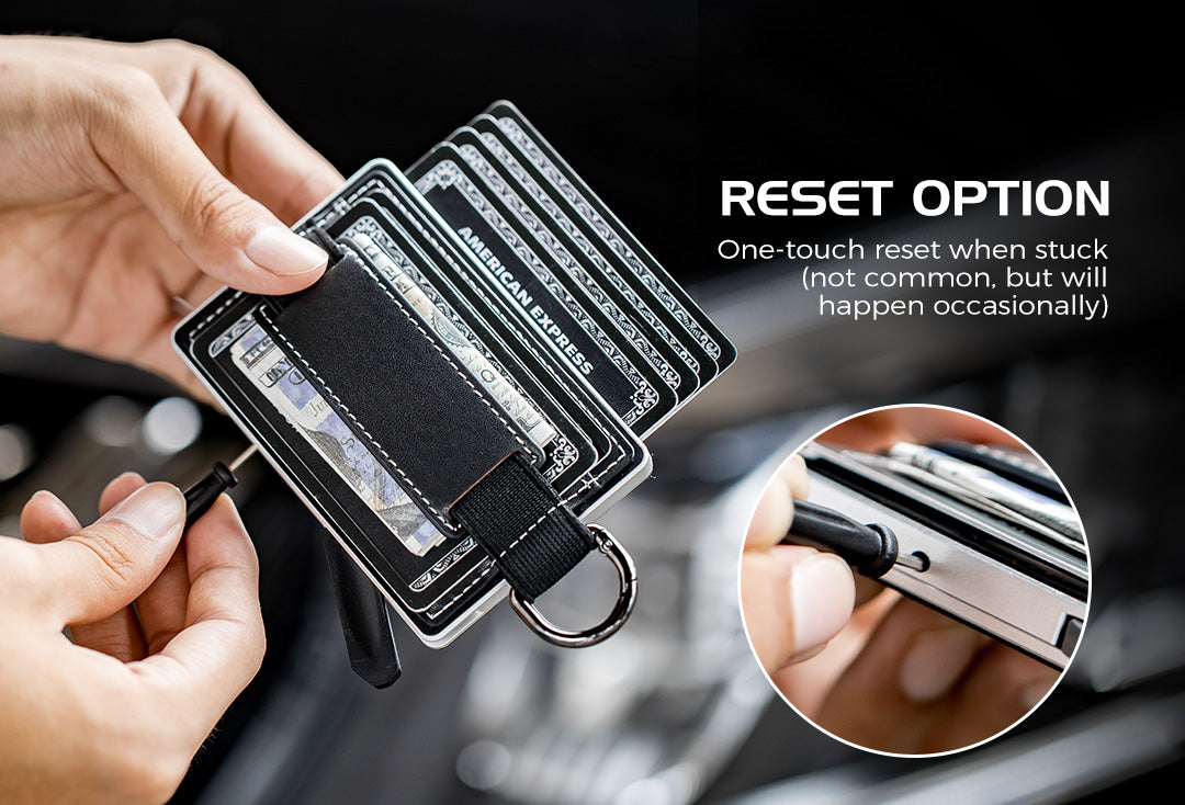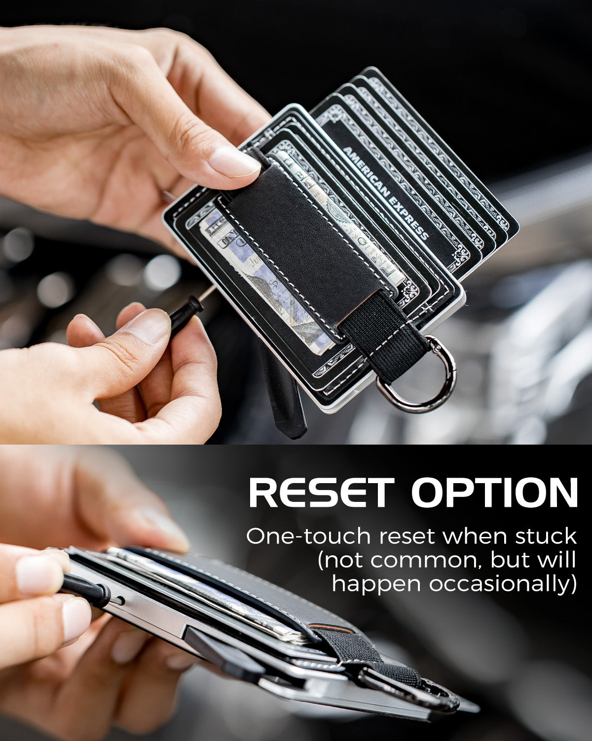 Quick eject button and five card storage, cash strap and coin slot for emergencies, metal ring and key or accessory storage