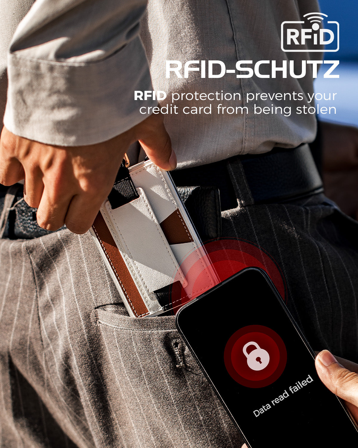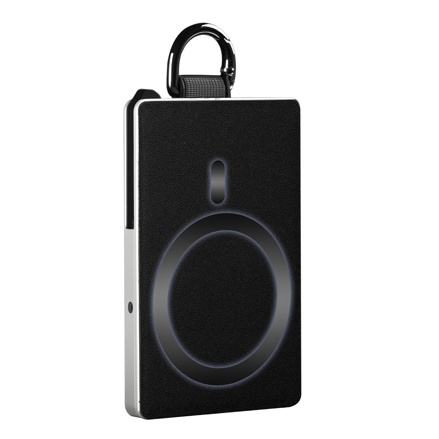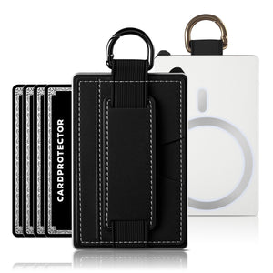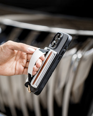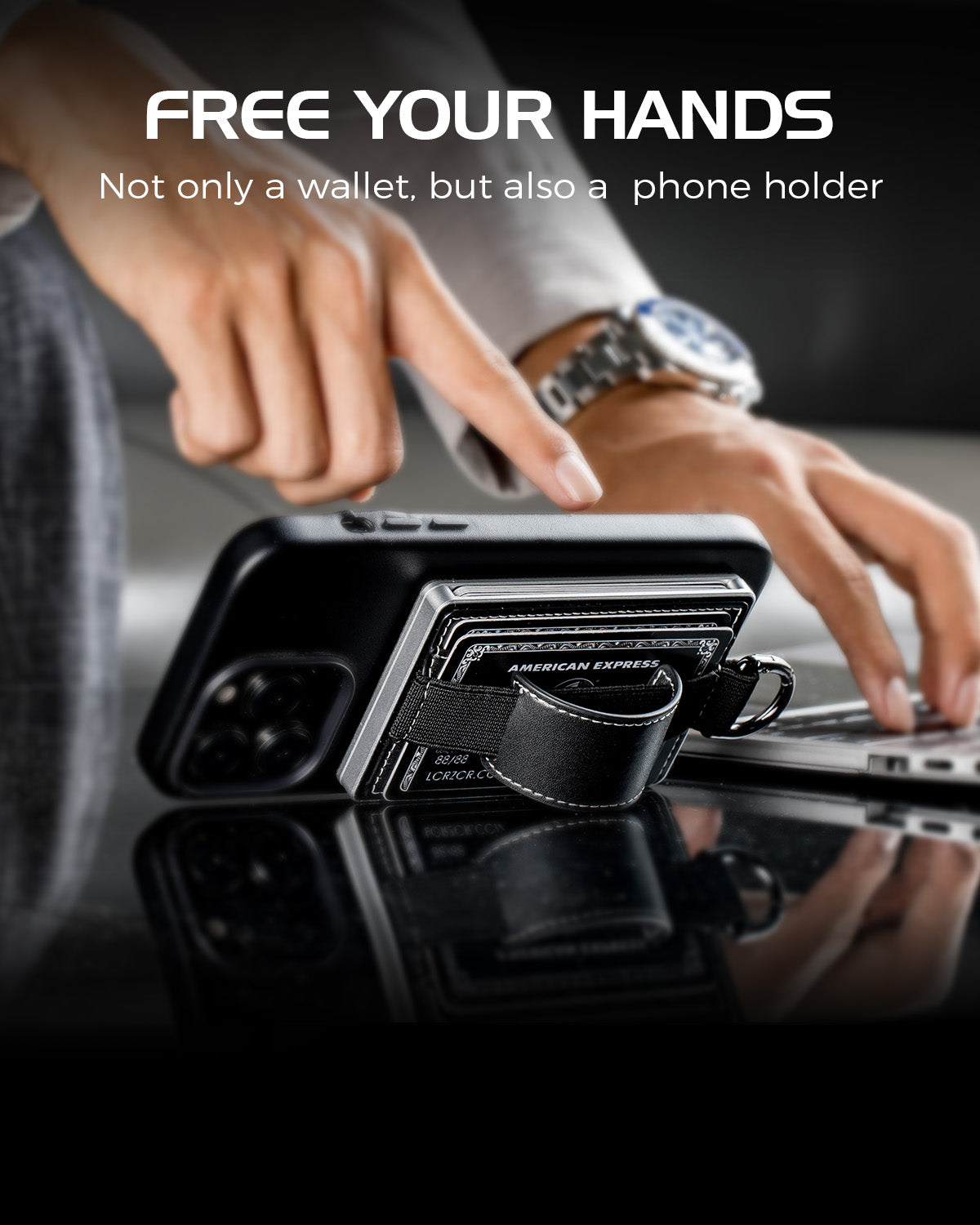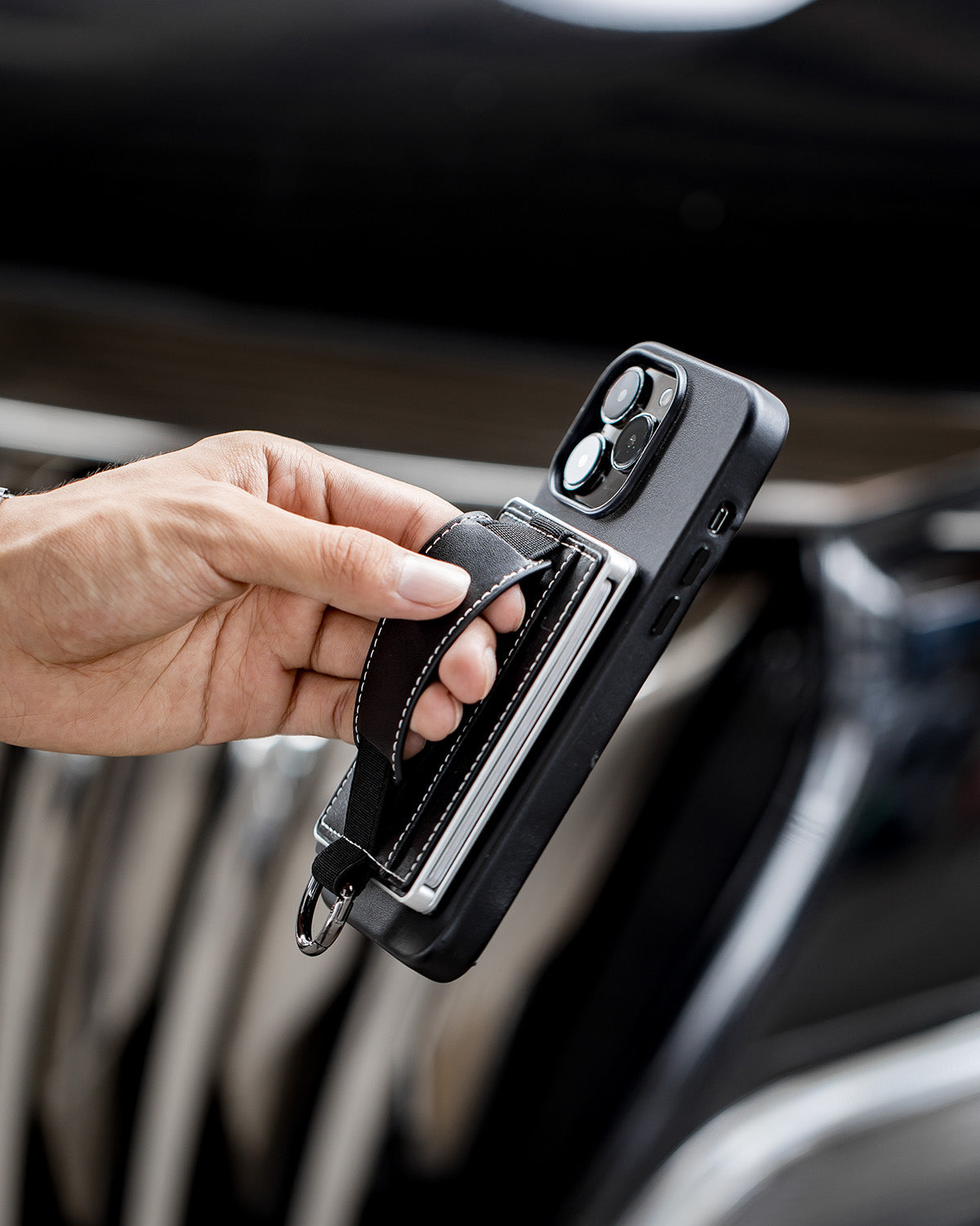 Quick eject button and five card storage, cash strap and coin slot for emergencies, metal ring and key or accessory storage