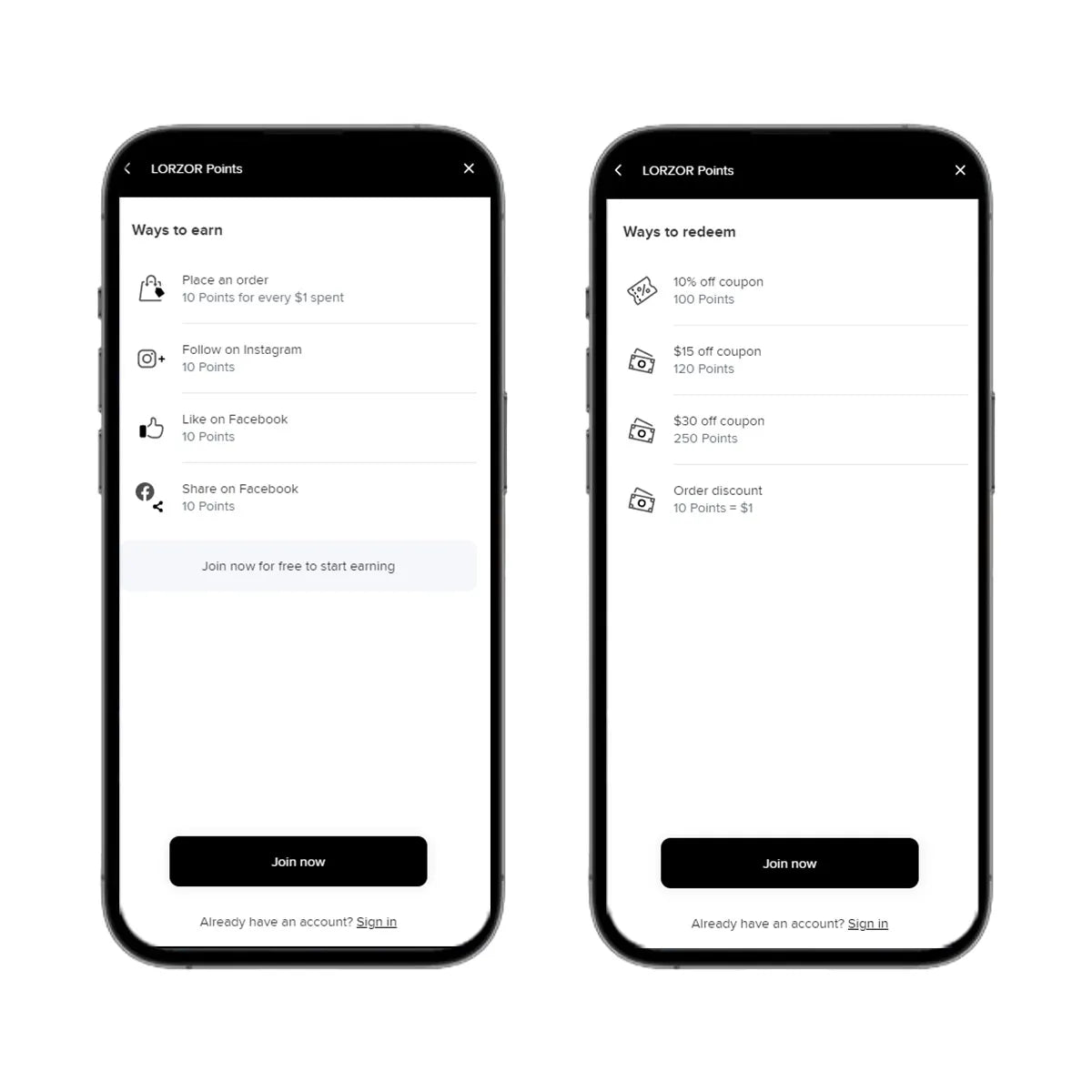 Become a LORZOR member and you will get member points by spending or completing designated tasks. Member points can be used to deduct consumption amounts according to a certain ratio, and can be exchanged for coupons. You will also receive the latest product push and promotional activity notifications from LORZOR in a timely manner.